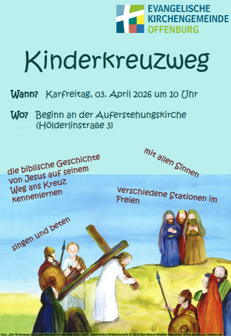 An Karfreitag, 03. April 2026, lädt die Evangelische Kirchengemeinde Offenburg alle Kinder mit Familie herzlich zu einem Kinderkreuzweg ein.