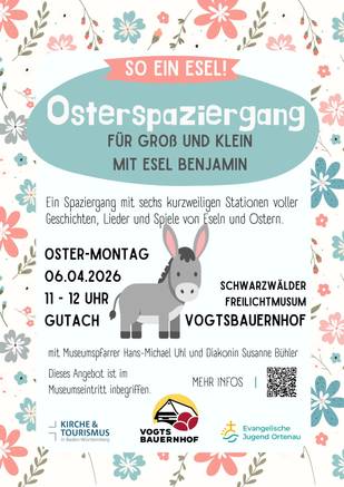 So ein Esel! Osterspaziergang am Ostermontag, 06. April 2026 um 11 Uhr für Groß und Klein mit Esel Benjamin Treffpunkt 11 Uhr im Pavillon gleich hinter dem Eingang des Freilichtmuseums Vogtsbauernhof