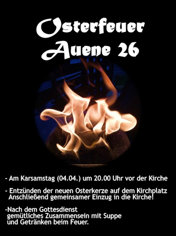 Am Karsamstag, 04. April 2026, um 20 Uhr wird vor der Evang. Kirche in Auenheim das Osterfeuer entfacht.